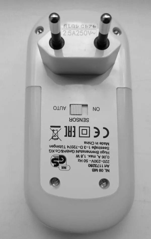 Paskirtis: Tai yra automatinis naktinis/orientacinis šviestuvas su judesio jutikliu, jungiamas tiesiai į elektros lizdą.