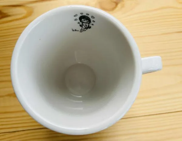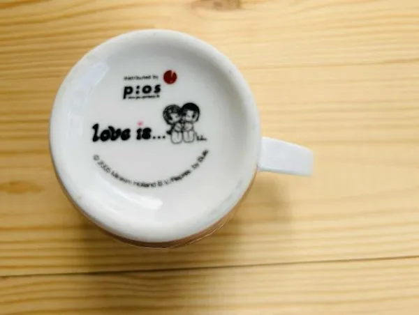 Šis puodelis LOVE IS... užbaigia žodžiais THE FIRST KISS (puodeliai turi seriją su skirtingomis pabaigomis).